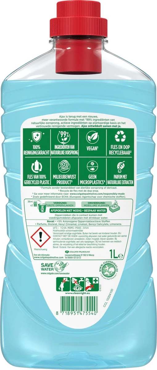 Laat je huis stralen en heerlijk ruiken met Ajax Fête des Fleurs Jasmijn allesreiniger. Deze Ajax allesreiniger heeft een nieuwe meer verantwoorde formule gemaakt van 99% ingrediënen van natuurlijke oorsprong en een sterkere langdurige geur. Ajax Fête des Fleurs Jasmijn zit daarnaast in een fles is gemaakt van 100% gerecycled plastic en 100% recyclebaar. Deze Ajax allesreiniger is vegan. Ajax schoonmaakmiddel respecteert ook kwetsbare oppervlakken zoals marmer en keramiek, waardoor alles weer heerlijk fris ruikt. Wanneer je zorgt voor je huis, kun je er gerust op zijn dat Ajax zorgt voor de planeet. Ajax ontwikkelt samen met jou!