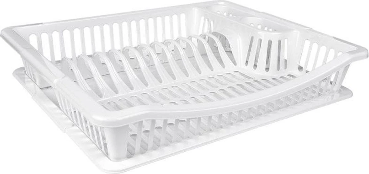 Een wit afdruiprekje/afwasrekje met een lekbak. Een modern afdruiprek met hoogwaardig kunststof voet. Dankzij de stevige constructie is het afdruiprek zelfs bij volle belading zeer stabiel. Het frame biedt veel ruimte en is voorzien van voldoende afvoergaten. De lekbak kunt u eventueel loshalen. Afmeting: ca. 36 x 45,5 x 8 cm. Materiaal: kunststof. Afwassen/de afwas doen huishoudelijke artikelen.